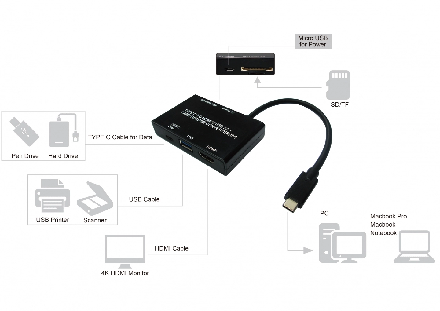 • USB Type C (Male) to HDMI® and USB 3.0 1 Port and Type C 1 Port and Card Reader.